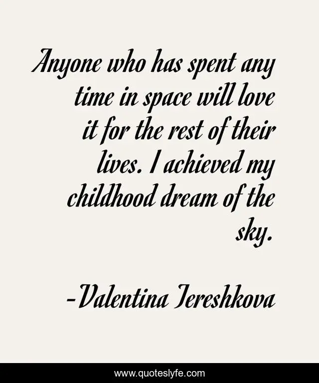 This page presents the quote "Anyone who has spent any time in space will love it for the rest of their lives. I achieved my childhood dream of the sky.". Author of this quote is Valentina Tereshkova. This quote is about love, sky, affection, time,.