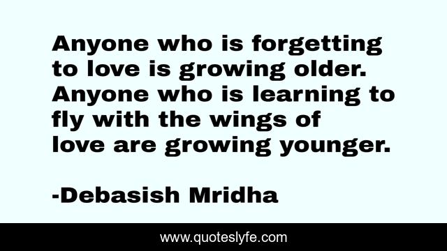 This page presents the quote "Anyone who is forgetting to love is growing older. Anyone who is learning to fly with the wings of love are growing younger.". Author of this quote is Debasish Mridha. This quote is about love, philosophy, debasish-mridha, young-and-old, wings-of-love, quotes, debasish-mridha-md, inspirational, enthusiasm,.