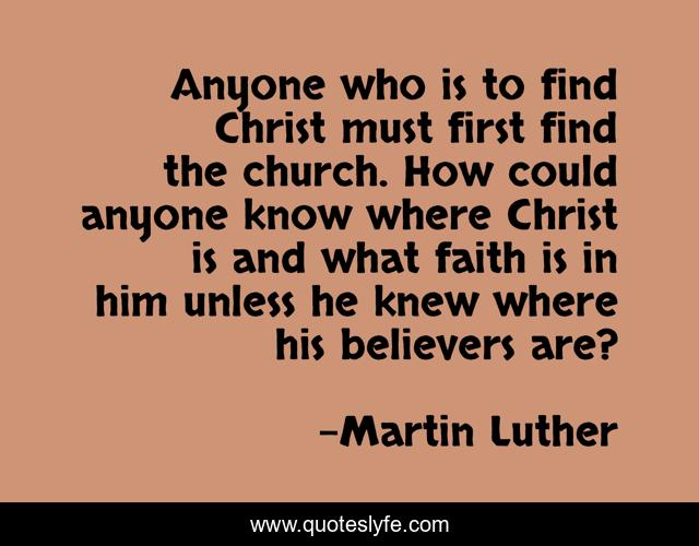 This page presents the quote "Anyone who is to find Christ must first find the church. How could anyone know where Christ is and what faith is in him unless he knew where his believers are?". Author of this quote is Martin Luther. This quote is about find, church,.