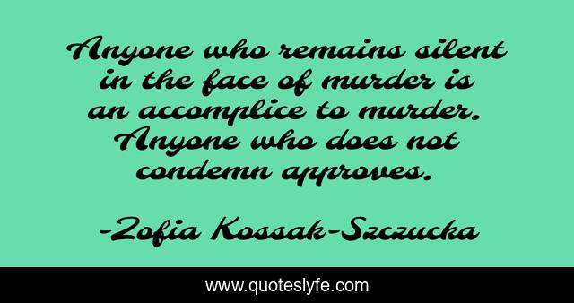 This page presents the quote "Anyone who remains silent in the face of murder is an accomplice to murder. Anyone who does not condemn approves.". Author of this quote is Zofia Kossak-Szczucka. This quote is about murder, silent, silence, violence,.