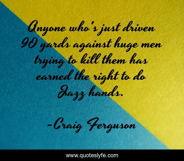 This page presents the quote "Anyone who's just driven 90 yards against huge men trying to kill them has earned the right to do Jazz hands.". Author of this quote is Craig Ferguson. This quote is about dance, football, celebration,.