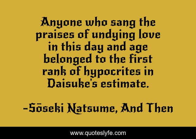 This page presents the quote "Anyone who sang the praises of undying love in this day and age belonged to the first rank of hypocrites in Daisuke's estimate.". Author of this quote is Sōseki Natsume, And Then. This quote is about meiji-era, love, hypocrisy, undying-love, hypocrites, affection,.