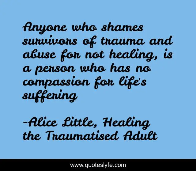 "Alice Little, Healing the Traumatised Adult Quotes." Quoteslyfe.com, 2025. Fri. 05 Dec. 2025. <https://www.quoteslyfe.com/quote/Anyone-who-shames-survivors-of-trauma-and-257877>.