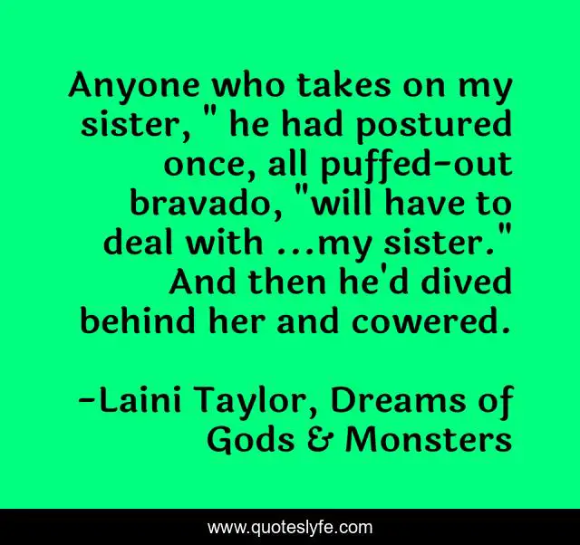 This page presents the quote "Anyone who takes on my sister, " he had postured once, all puffed-out bravado, "will have to deal with ...my sister." And then he'd dived behind her and cowered.". Author of this quote is Laini Taylor, Dreams of Gods & Monsters. .