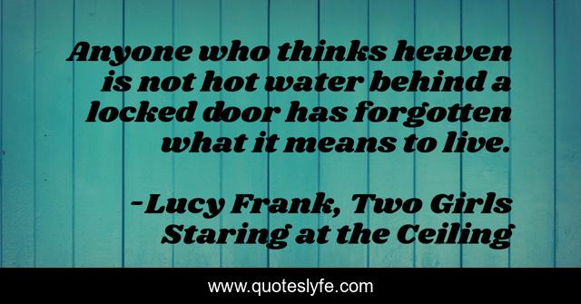 This page presents the quote "Anyone who thinks heaven is not hot water behind a locked door has forgotten what it means to live.". Author of this quote is Lucy Frank, Two Girls Staring at the Ceiling. This quote is about heaven, baths, peace, hot-water, soothing,.