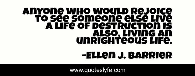 This page presents the quote "Anyone who would rejoice to see someone else live a life of destruction is also, living an unrighteous life.". Author of this quote is Ellen J. Barrier. This quote is about life, unrighteous, destruction,.