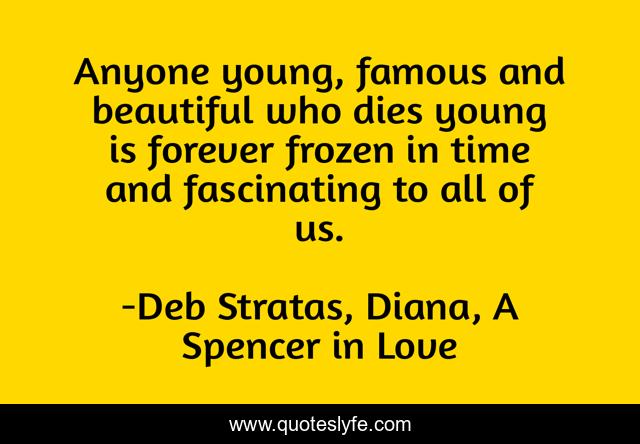 This page presents the quote "Anyone young, famous and beautiful who dies young is forever frozen in time and fascinating to all of us.". Author of this quote is Deb Stratas, Diana, A Spencer in Love. This quote is about princess-diana, royal, historical-fiction,.