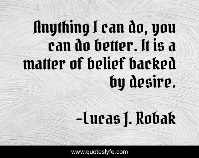 This page presents the quote "Anything I can do, you can do better. It is a matter of belief backed by desire.". Author of this quote is Lucas J. Robak. This quote is about confidence, success, inspriational, positive, motivational, optimistic,.