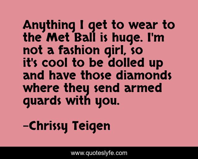 This page presents the quote "Anything I get to wear to the Met Ball is huge. I'm not a fashion girl, so it's cool to be dolled up and have those diamonds where they send armed guards with you.". Author of this quote is Chrissy Teigen. This quote is about girl, fashion, diamonds,.