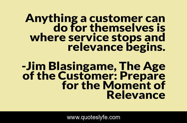 This page presents the quote "Anything a customer can do for themselves is where service stops and relevance begins.". Author of this quote is Jim Blasingame, The Age of the Customer: Prepare for the Moment of Relevance. This quote is about customers, business, customer-service,.