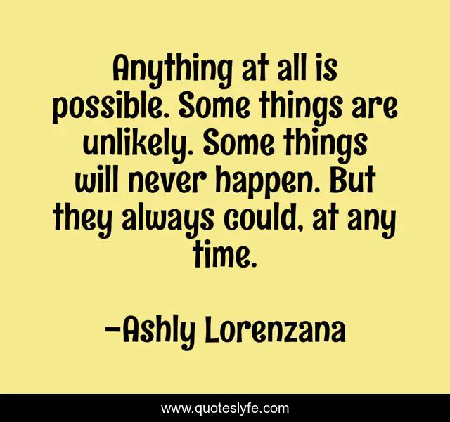 This page presents the quote "Anything at all is possible. Some things are unlikely. Some things will never happen. But they always could, at any time.". Author of this quote is Ashly Lorenzana. This quote is about possibility, probability,.