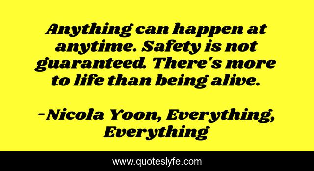 This page presents the quote "Anything can happen at anytime. Safety is not guaranteed. There's more to life than being alive.". Author of this quote is Nicola Yoon, Everything, Everything. .