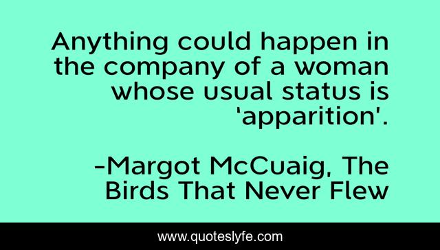 This page presents the quote "Anything could happen in the company of a woman whose usual status is ‘apparition’.". Author of this quote is Margot McCuaig, The Birds That Never Flew. This quote is about virgin-mary, literature, glasgow, women,.