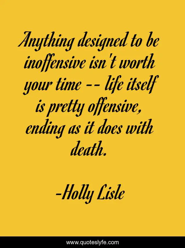 This page presents the quote "Anything designed to be inoffensive isn't worth your time -- life itself is pretty offensive, ending as it does with death.". Author of this quote is Holly Lisle. This quote is about offense, life, humor, writing,.