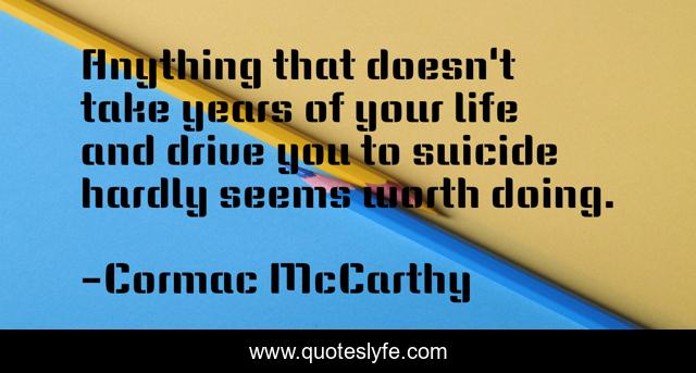 This page presents the quote "Anything that doesn't take years of your life and drive you to suicide hardly seems worth doing.". Author of this quote is Cormac McCarthy. This quote is about life, humor,.
