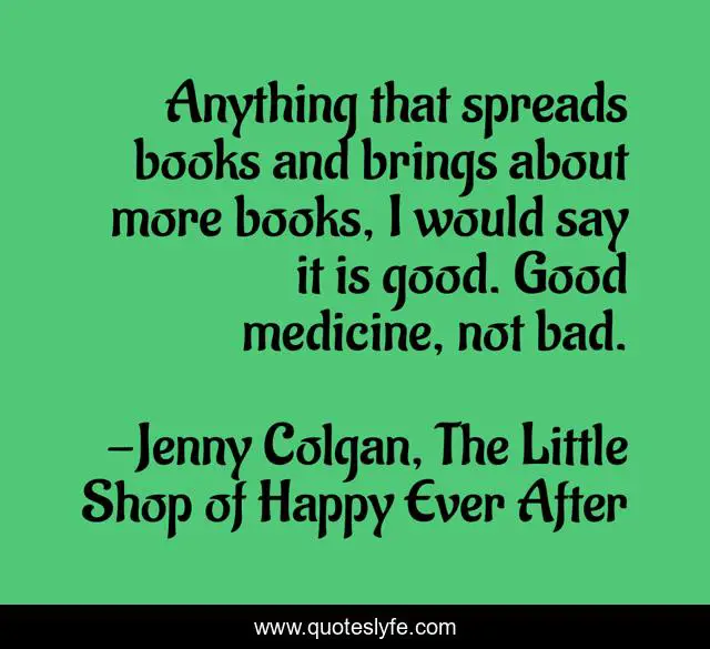 This page presents the quote "Anything that spreads books and brings about more books, I would say it is good. Good medicine, not bad.". Author of this quote is Jenny Colgan, The Little Shop of Happy Ever After. This quote is about medicine, books, reading,.