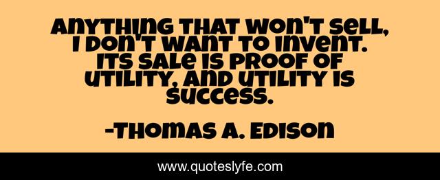 This page presents the quote "Anything that won't sell, I don't want to invent. Its sale is proof of utility, and utility is success.". Author of this quote is Thomas A. Edison. This quote is about sell, anything,.