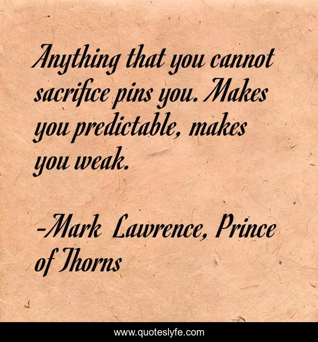 This page presents the quote "Anything that you cannot sacrifice pins you. Makes you predictable, makes you weak.". Author of this quote is Mark Lawrence, Prince of Thorns. This quote is about weakness, sacrifice, predictability,.