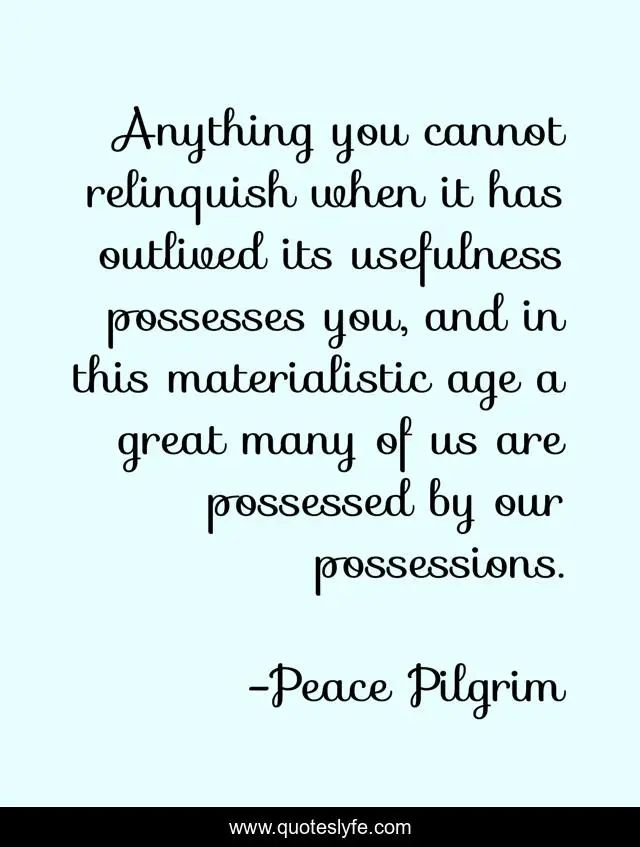 This page presents the quote "Anything you cannot relinquish when it has outlived its usefulness possesses you, and in this materialistic age a great many of us are possessed by our possessions.". Author of this quote is Peace Pilgrim. This quote is about great, anything,.
