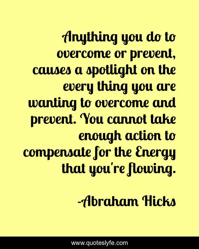 This page presents the quote "Anything you do to overcome or prevent, causes a spotlight on the every thing you are wanting to overcome and prevent. You cannot take enough action to compensate for the Energy that you're flowing.". Author of this quote is Abraham Hicks. This quote is about prevent, energy, cause,.