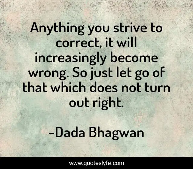 This page presents the quote "Anything you strive to correct, it will increasingly become wrong. So just let go of that which does not turn out right.". Author of this quote is Dada Bhagwan. This quote is about increasingly, turn, spiritual, right, correct,.