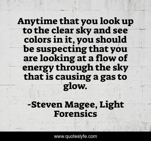 This page presents the quote "Anytime that you look up to the clear sky and see colors in it, you should be suspecting that you are looking at a flow of energy through the sky that is causing a gas to glow.". Author of this quote is Steven Magee, Light Forensics. This quote is about glow, color, gas, clear, flow, colors, energy-force, glowing, energy-field,.