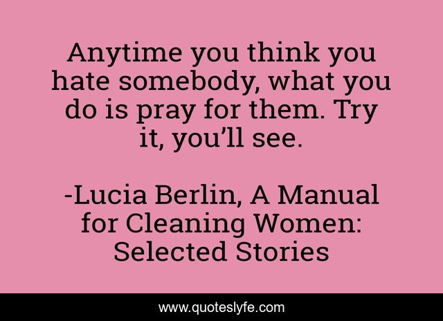 This page presents the quote "Anytime you think you hate somebody, what you do is pray for them. Try it, you’ll see.". Author of this quote is Lucia Berlin, A Manual for Cleaning Women: Selected Stories. This quote is about pray, hate,.