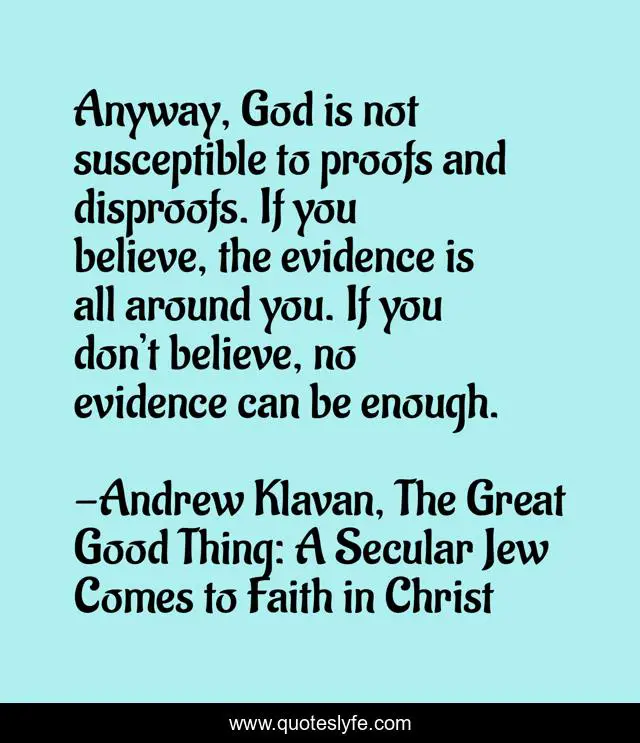 "Andrew Klavan, The Great Good Thing: A Secular Jew Comes to Faith in Christ Quotes." Quoteslyfe.com, 2025. Sat. 06 Dec. 2025. <https://www.quoteslyfe.com/quote/Anyway-God-is-not-susceptible-to-proofs-111082>.