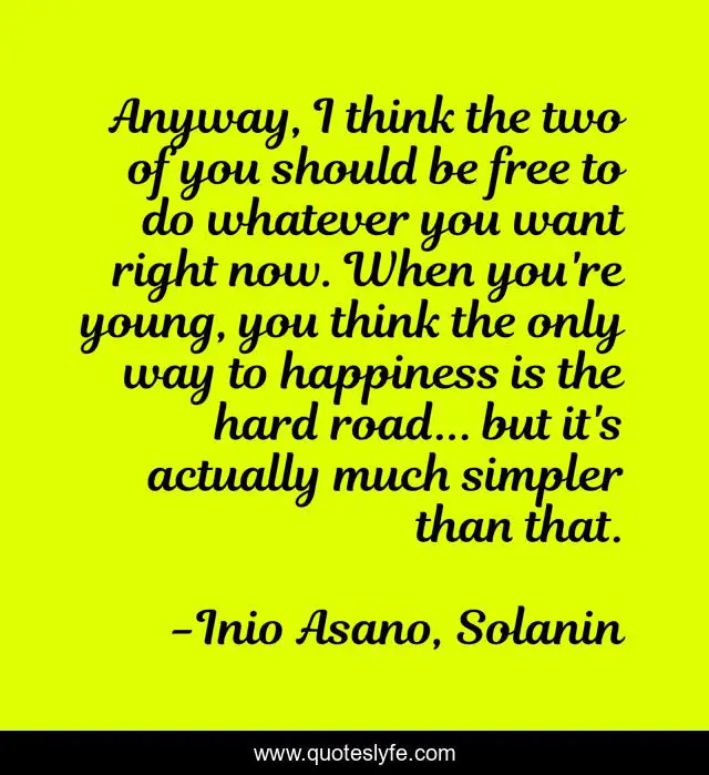 This page presents the quote "Anyway, I think the two of you should be free to do whatever you want right now. When you're young, you think the only way to happiness is the hard road... but it's actually much simpler than that.". Author of this quote is Inio Asano, Solanin. This quote is about path, life, carefree, road, difficult,.