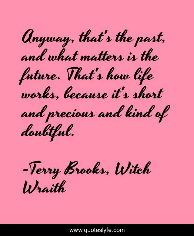 This page presents the quote "Anyway, that's the past, and what matters is the future. That's how life works, because it's short and precious and kind of doubtful.". Author of this quote is Terry Brooks, Witch Wraith. This quote is about life-philosophy, life-lessons,.