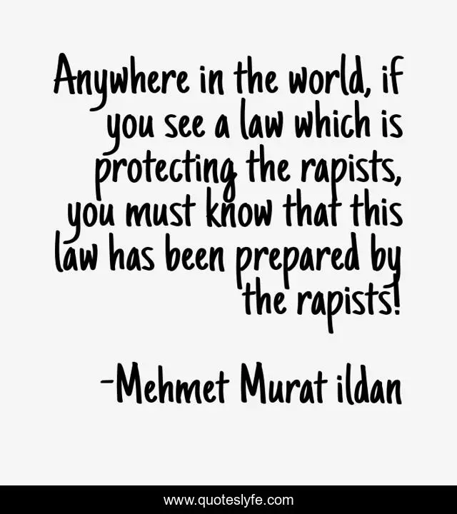 This page presents the quote "Anywhere in the world, if you see a law which is protecting the rapists, you must know that this law has been prepared by the rapists!". Author of this quote is Mehmet Murat ildan. This quote is about rapists, mehmet-murat-ildan, ildan-wise-sayings, turkish, ildan-wisdom, rape-culture, turkish-playwrights, rape-laws, laws-of-rape,.