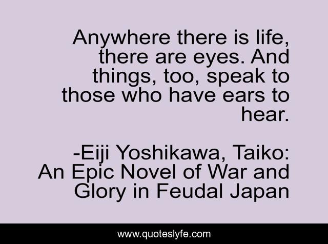This page presents the quote "Anywhere there is life, there are eyes. And things, too, speak to those who have ears to hear.". Author of this quote is Eiji Yoshikawa, Taiko: An Epic Novel of War and Glory in Feudal Japan. This quote is about secrets, eyes, observing,.