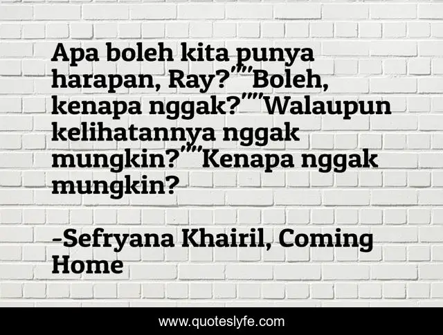 This page presents the quote "Apa boleh kita punya harapan, Ray?""Boleh, kenapa nggak?""Walaupun kelihatannya nggak mungkin?""Kenapa nggak mungkin?". Author of this quote is Sefryana Khairil, Coming Home. This quote is about romance, love, affection,.