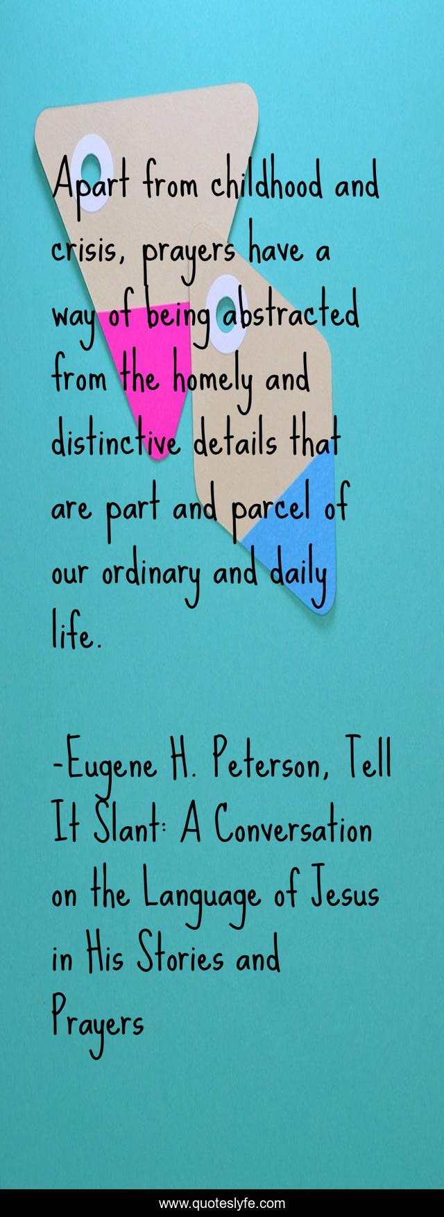 This page presents the quote "Apart from childhood and crisis, prayers have a way of being abstracted from the homely and distinctive details that are part and parcel of our ordinary and daily life.". Author of this quote is Eugene H. Peterson, Tell It Slant: A Conversation on the Language of Jesus in His Stories and Prayers. This quote is about pride, humility,.