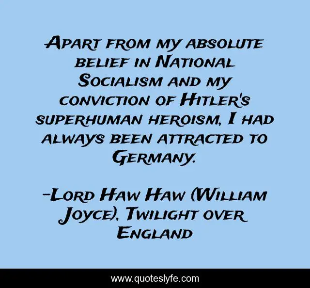 This page presents the quote "Apart from my absolute belief in National Socialism and my conviction of Hitler's superhuman heroism, I had always been attracted to Germany.". Author of this quote is Lord Haw Haw (William Joyce), Twilight over England. This quote is about strength, belief, idol, inspiration,.