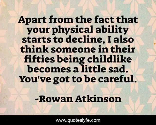 This page presents the quote "Apart from the fact that your physical ability starts to decline, I also think someone in their fifties being childlike becomes a little sad. You've got to be careful.". Author of this quote is Rowan Atkinson. This quote is about think, be careful,.