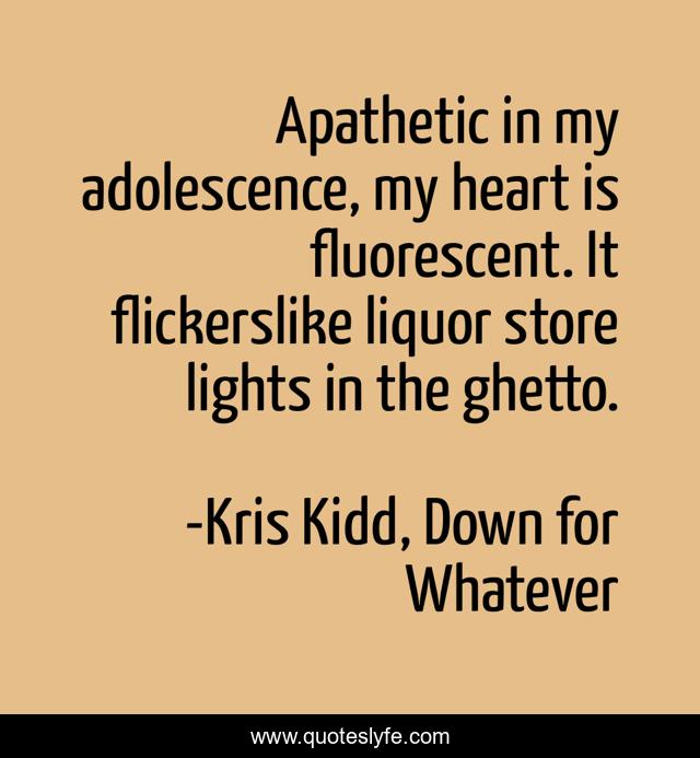 This page presents the quote "Apathetic in my adolescence, my heart is fluorescent. It flickerslike liquor store lights in the ghetto.". Author of this quote is Kris Kidd, Down for Whatever. This quote is about youth, addiction, apathy, adolescence,.