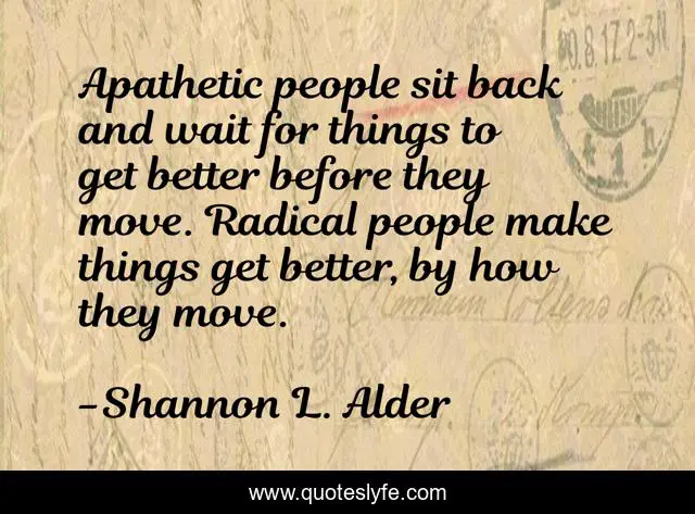 This page presents the quote "Apathetic people sit back and wait for things to get better before they move. Radical people make things get better, by how they move.". Author of this quote is Shannon L. Alder. This quote is about passiveness, success, apathy, action, mediocrity, inspiration,.