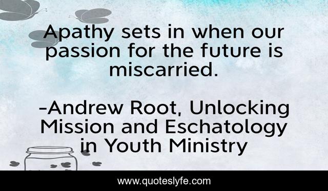 This page presents the quote "Apathy sets in when our passion for the future is miscarried.". Author of this quote is Andrew Root, Unlocking Mission and Eschatology in Youth Ministry. This quote is about youth-ministry, mission, apathy,.