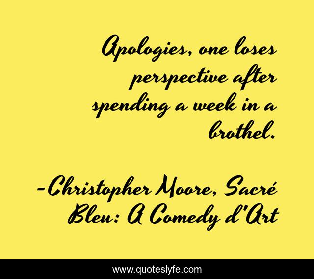 This page presents the quote "Apologies, one loses perspective after spending a week in a brothel.". Author of this quote is Christopher Moore, Sacré Bleu: A Comedy d'Art. This quote is about apologies, perspective, brothels,.