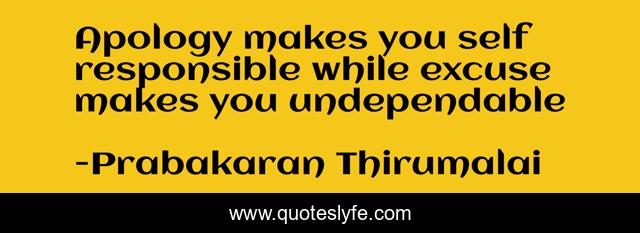This page presents the quote "Apology makes you self responsible while excuse makes you undependable". Author of this quote is Prabakaran Thirumalai. This quote is about dependability, responsibility, apology, excuse,.