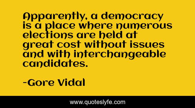 This page presents the quote "Apparently, a democracy is a place where numerous elections are held at great cost without issues and with interchangeable candidates.". Author of this quote is Gore Vidal. This quote is about great, place, democracy,.