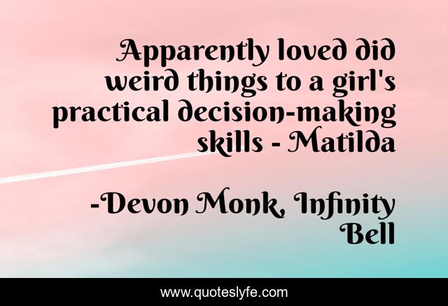 This page presents the quote "Apparently loved did weird things to a girl's practical decision-making skills - Matilda". Author of this quote is Devon Monk, Infinity Bell. This quote is about humor, love, science-fiction, affection,.