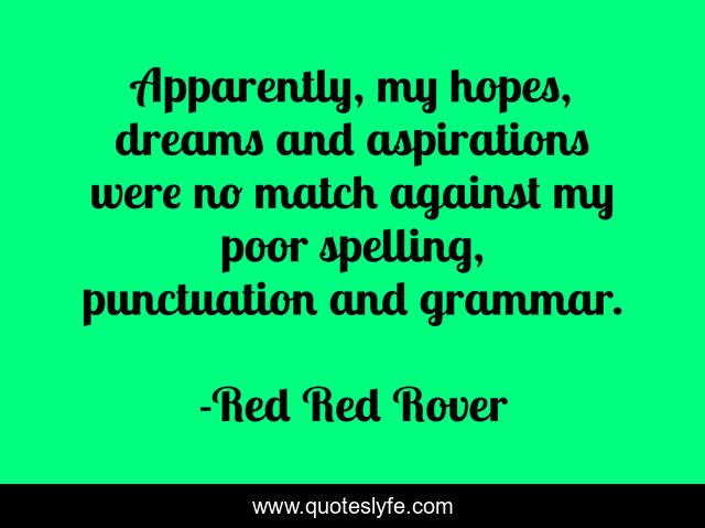 This page presents the quote "Apparently, my hopes, dreams and aspirations were no match against my poor spelling, punctuation and grammar.". Author of this quote is Red Red Rover. This quote is about grammar, publishing, punctuation, ideas, writing, aspirations, hopes, rejection, spelling,.