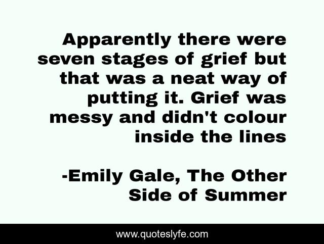 This page presents the quote "Apparently there were seven stages of grief but that was a neat way of putting it. Grief was messy and didn't colour inside the lines". Author of this quote is Emily Gale, The Other Side of Summer. This quote is about mystery, love, reuniting, unification, depression, separation, friendship, affection,.