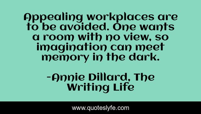 This page presents the quote "Appealing workplaces are to be avoided. One wants a room with no view, so imagination can meet memory in the dark.". Author of this quote is Annie Dillard, The Writing Life. This quote is about imagination, memory, writing,.
