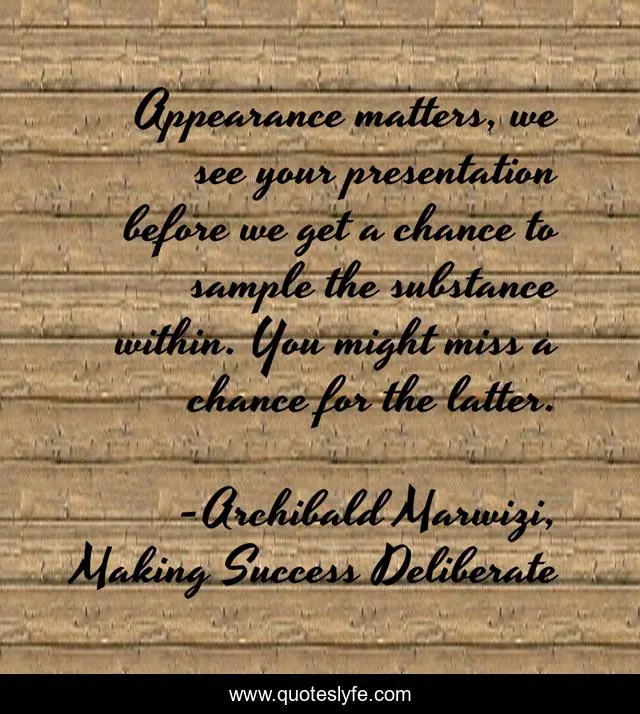 This page presents the quote "Appearance matters, we see your presentation before we get a chance to sample the substance within. You might miss a chance for the latter.". Author of this quote is Archibald Marwizi, Making Success Deliberate. This quote is about life, success, behaviour, attitude, legacy, growth, purpose, inspirational, leadership,.