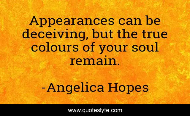 This page presents the quote "Appearances can be deceiving, but the true colours of your soul remain.". Author of this quote is Angelica Hopes. This quote is about conscience, misjudgment, character, identity,.