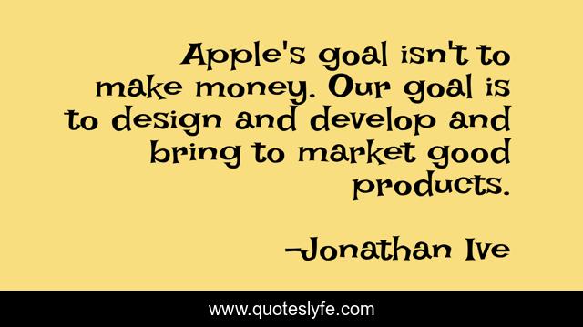 This page presents the quote "Apple's goal isn't to make money. Our goal is to design and develop and bring to market good products.". Author of this quote is Jonathan Ive. This quote is about money, good, goal,.