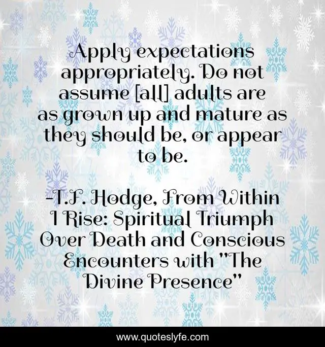 This page presents the quote "Apply expectations appropriately. Do not assume [all] adults are as grown up and mature as they should be, or appear to be.". Author of this quote is T.F. Hodge, From Within I Rise: Spiritual Triumph Over Death and Conscious Encounters with "The Divine Presence". This quote is about maturity, appropriate-application, expectations, mature, adult,.